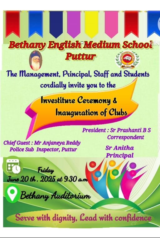 ದಿನಾಂಕ 20.06.2025ರಂದು ಪುತ್ತೂರು ಪಾಂಗ್ಳಾಯಿ ಬೆಥನಿ ಆಂಗ್ಲ ಮಾಧ್ಯಮ ಶಾಲೆಯ 2025-26ನೇ ಸಾಲಿನ ಶಾಲಾ ಮಂತ್ರಿ ಮಂಡಲದ ಪ್ರಮಾಣ ವಚನ ಮತ್ತು ವಿವಿಧ ಸಂಘಗಳ ಉದ್ಘಾಟನಾ ಸಮಾರಂಭವನ್ನು ದೀಪ ಬೆಳಗಿಸುವುದ ಮೂಲಕ ನಡೆಸಲಾಯಿತು. ಶಾಲಾ ನಾಯಕಿಯಾಗಿ ಕುಮಾರಿ ವಿಯೋಲ್ಲಾ ಎಶಿತಾ ಮೊಂತೆರೋ, ನಾಯಕ ಮೆಲ್ ರೋಯಿ ಪಿರೇರ